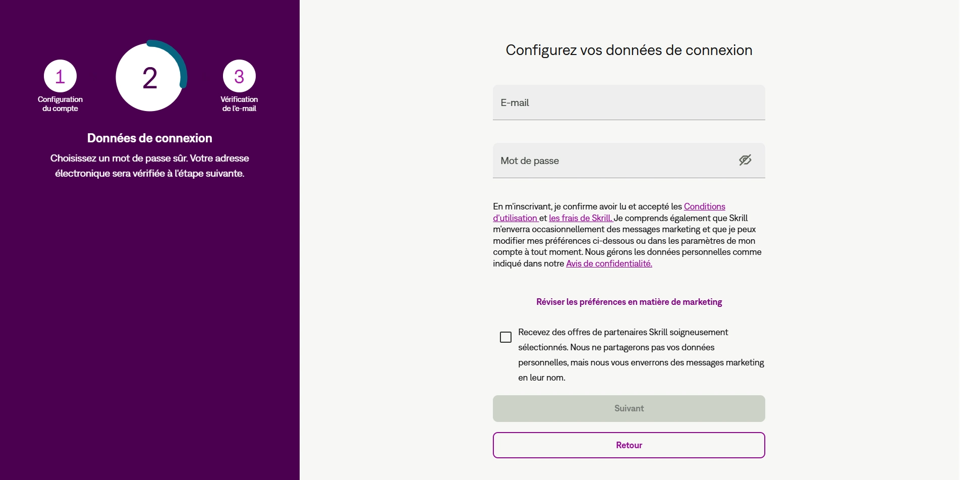 Tu vas sur le site de Skrill ou tu télécharges l’appli (je suis passé par l’appli). Là, on te demande juste une adresse mail et un mot de passe. Pas besoin d’ajouter ta carte tout de suite.